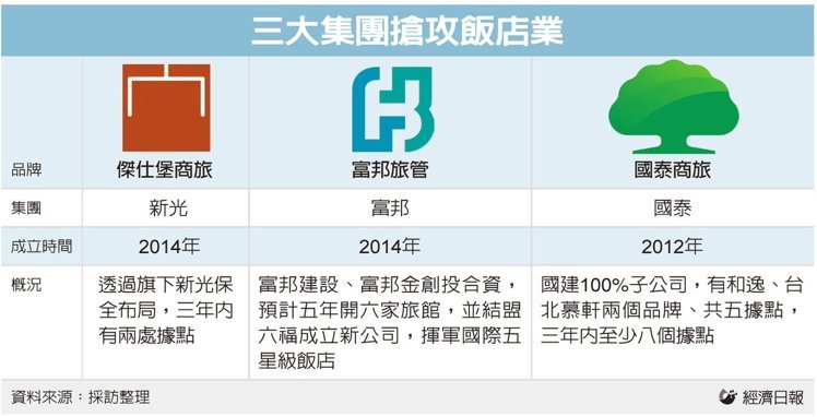 富邦、國泰、新光等三大集團戰火從金融市場延燒到飯店業,紛紛成立新公司,宣示深耕飯店業的決心,預估三年內飯店數至少要達13家,引起飯店業關注。
