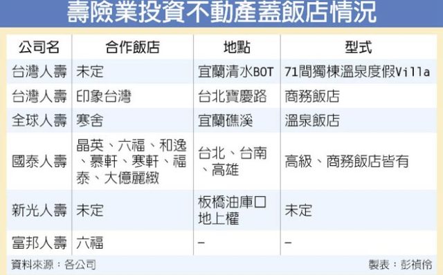 部分地區商辦飽和,壽險業投資不動產近期轉向與飯店業者合作,希望興建飯店、旅館搶占國內觀光客倍增的商機,目前如國泰人壽、新光人壽、台灣人壽、全球人壽及富邦人壽有興建飯店的計畫或正在興建。