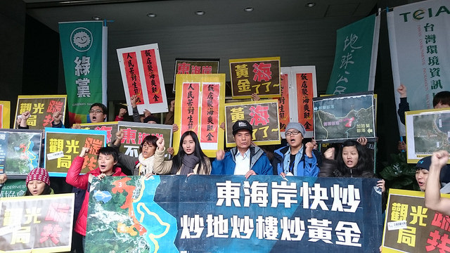 | 「都蘭黃金海休閒度假村」七度環差,當地居民與民間團體到場關注,要求觀光局做政策環評。攝影:賴品瑀 |