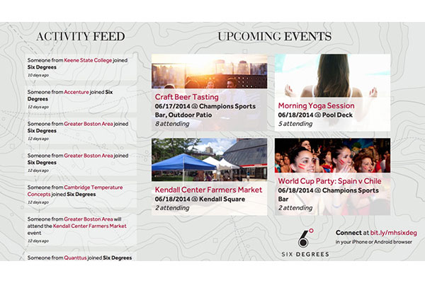 美國麻省理工學院行動通訊體驗實驗室所創作,而由萬豪酒店集團推出的「六度連結」(源自於「六度分隔理論」– Six Degrees of Separation)系統。這是個實體的社交網絡經由手機應用程式、數位牆面投影以及擺放在大廳的互動式木桌促使顧客們能在酒店空間裡實際參與活動。這套系統藉由顧客的 LinkedIn帳戶將相關資訊推及至顧客,包含工作單位及個人興趣。而經由該系統的手機應用程式,顧客能夠在酒店方所安排的活動(例如在清新的公園中慢跑、品嚐手工精釀啤酒等)中盡情發揮自己的興趣與愛好。