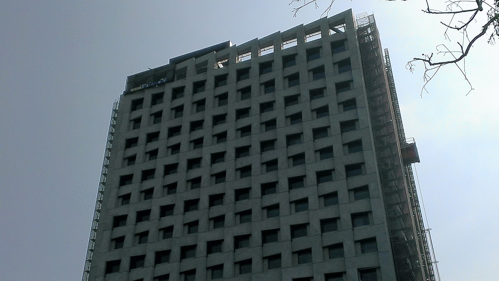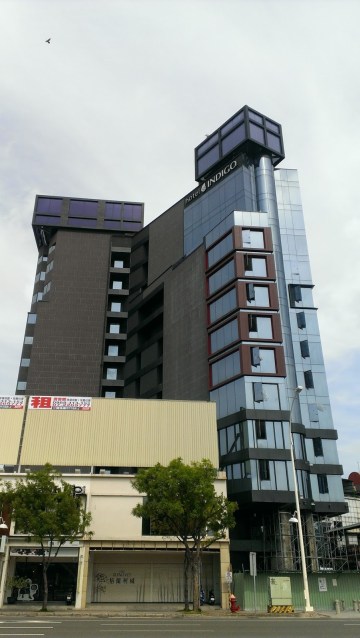 高雄中央公園英迪格酒店目前的外觀,透過玻璃帷幕隱約可見室內裝潢仍在加緊趕工中