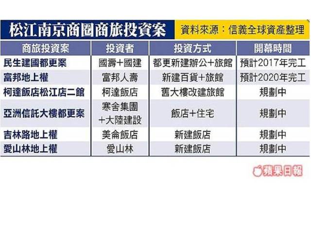 信義全球資產經理王維宏表示,都更及地上權開發案,可重新規劃,因此定位較多元,複合商用不動產開發方式可有效聚集人潮,待其他大型投資案開發完成,將進一步帶動周邊商業活動,松江南京商圈可望躋身站前西門商圈外,旅館業一級戰區。