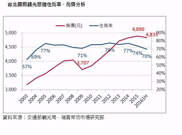 國際獨立地產顧問公司萊坊(Knight Frank)發表 2016 年「大中華區旅館報告」,上半年台北國際觀光旅館住房率下跌至 70%,跌幅比其他城市減少幅度還大,且創 2003 年 SARS 以來新低,住房價微跌 1.1%。