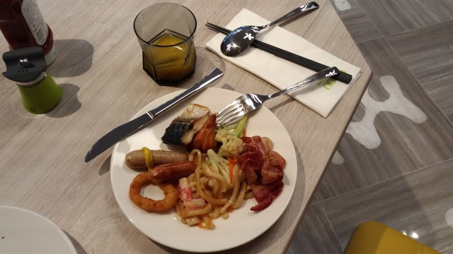| 烤魚+炒烏龍+時蔬+香腸培根與洋蔥圈(左上方的綠罐是鹽,隔壁是某知名蕃茄醬) |