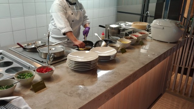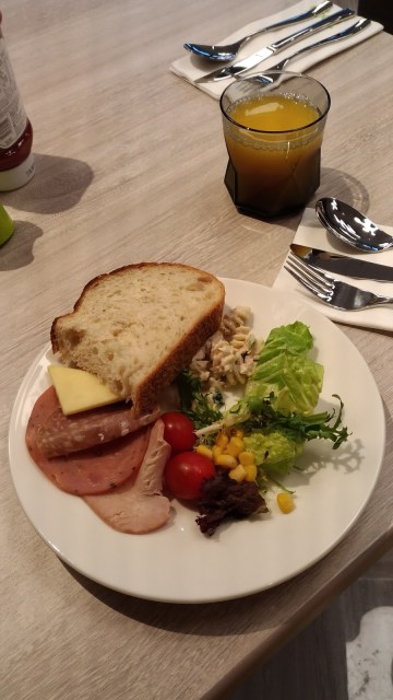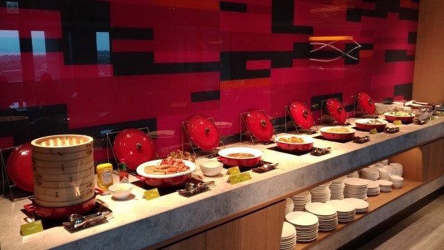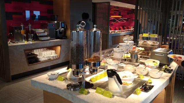 | 左前:飲料區(咖啡、茶、果汁、開水);中島:沙拉、冷盤、麵包、水果及穀類早餐 |