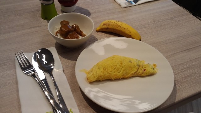| 現作的蛋捲(可自選配料,我選的是綜合)+咖哩飯(味道濃郁)+小小兵最愛的香蕉 |