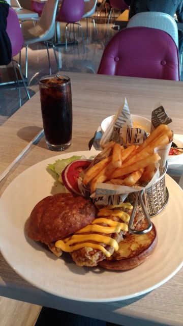 | 中間:雅樂軒雞腿漢堡附薯條;左後:Coke Zero |
