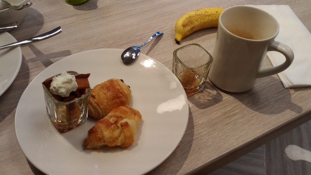 | 飯後甜點:鬆餅佐蜂蜜與鮮奶油+小丹麥麵包+小可頌+研磨咖啡一杯(香蕉這時才吃) |