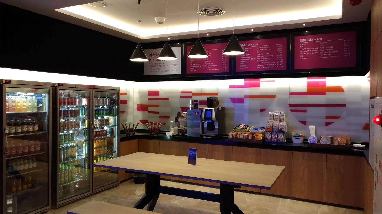 不知是否還有記得第二篇客房介紹的伏筆,就是在客房內單純讓客人擺放飲料或食物的小冰箱(因為是空的)?目前這個能量站算是所謂的「客房Mini Bar(迷你點心飲料吧) 2.0版」→集中在一處方便管理,而客人也能直接取用較多的數量,並多了研磨咖啡機與新鮮水果。稍做觀察,如果曾留意過五星級大飯店的客房Mini Bar內容,若不計入酒精性飲料,幾乎都在此,所以才稱作客房Mini Bar 2.0版,只是相對而言,Re: fuel 能量站也有其進階版本,即輕食(麵包、三明治、沙拉等)的販售,類似於星巴克或烘焙坊的冷藏保鮮櫃內以及便利商店的販售品項,個人2011年曾在北京海淀雅樂軒酒店(亞洲元老級雅樂軒)看過。由於目前是試營運時期,或許正式營運之後,隨著客流量的增加,應該有機會進行升級改裝。
