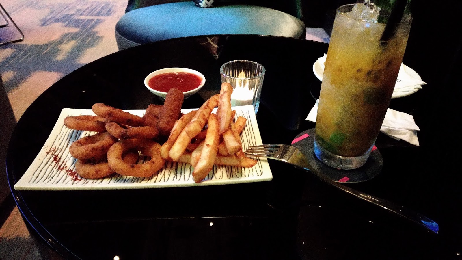 晚餐的下半場,則由調酒與配酒點心出場。Mango Mojito是一般Mojito加上芒果泥,增添了熱帶風味,甜甜的不錯喝,而綜合酥炸拼盤由洋蔥圈、乳酪條、薯條組合而成,趁熱吃啵棒的。