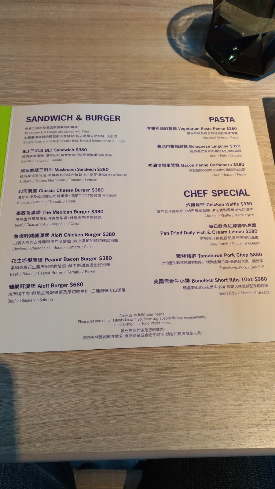 菜單上的價格以三、四百元左右居多,最低在二百元左右,最高在一千元左右的排餐,屬於中價位美式餐廳(市場上類似價位的餐廳其實很多),酒水類價格與品項則是與WXYZ吧相同。服務人員O小姐考量到我稍早前已用過早餐,於是午餐的份量可以小些,招牌的雅樂軒漢堡份量大會太撐,可以試試其他主餐像是義大利麵或份量較小的漢堡餐。於是在仍有些飽的狀態下,點了雅樂軒雞腿漢堡與Coke Zero。O小姐另外提醒,由於餐點都是現做,需要一些等待時間。