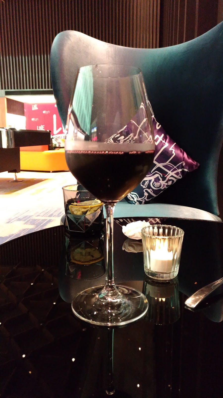 最後是以單杯紅酒來結束當晚的用餐行程,適合慢慢喝,徐徐品嚐外加消磨時間。當時詢問服務人員哪種紅酒比較不澀,後來由一位長相有些混血的調酒人員 J 先生對酒單給建議,喝起來確實不怎麼澀。