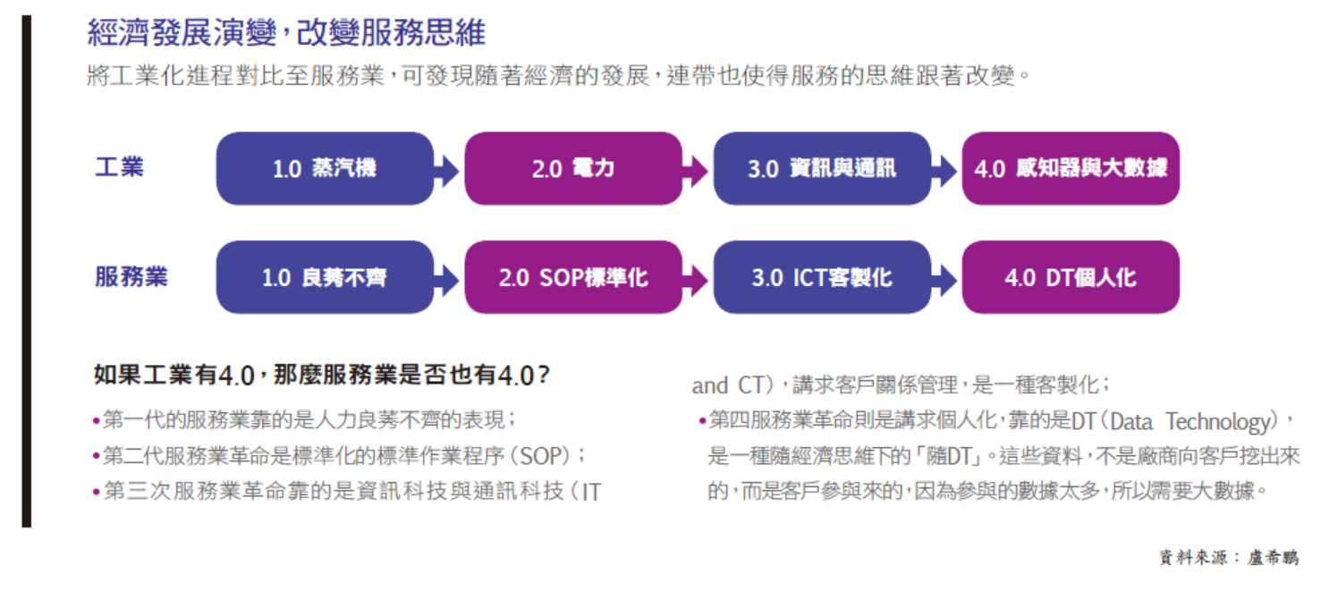 「第一代服務業靠的是人力良莠不齊的表現,第二代服務業革命是標準化的SOP,第三次服務業革命則是資訊科技與通訊科技、講求客製化,第四次服務業革命講求個人化、靠的是資料科技。」