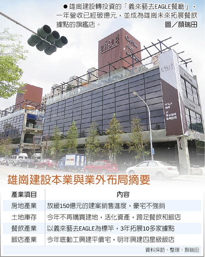 | 雄崗建設轉投資的「義來藝去EAGLE餐廳」,一年營收已經破億元,並成為雄崗未來拓展餐飲據點的旗艦店。圖/顏瑞田 雄崗建設本業與業外布局摘要 |