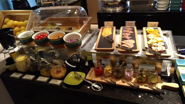 | 右:冷盤、乳酪、醃菜;左:生菜沙拉區(最左方是一粒粒葡萄柚) |