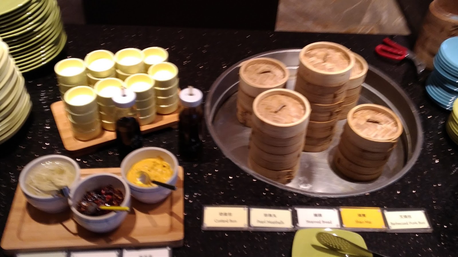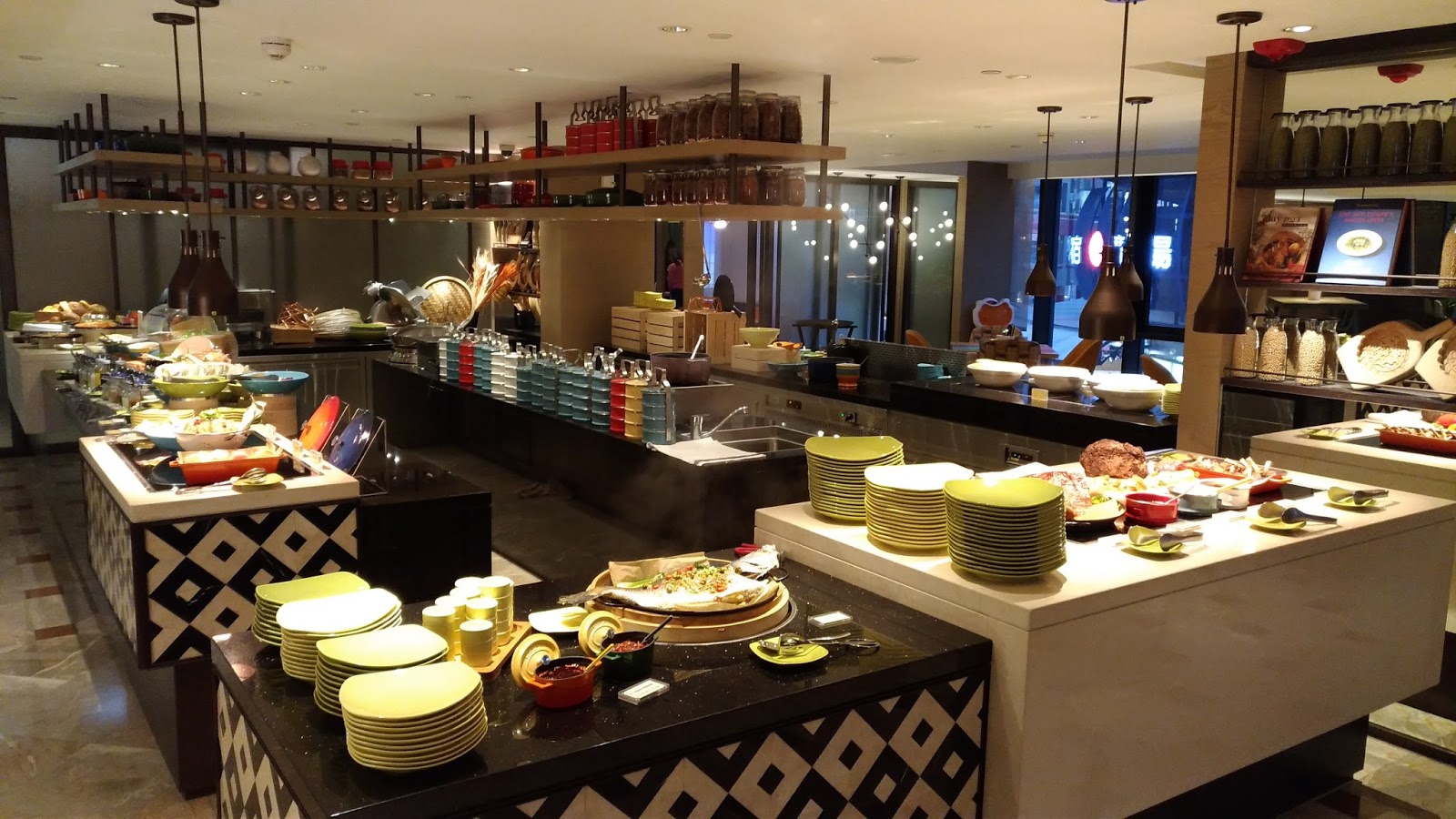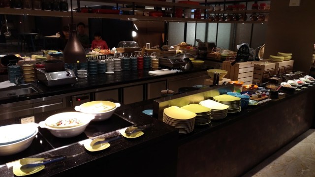 | 晚餐時段的餐檯。餐廳的服務方式以半自助式供應→主菜+自助餐點&飲料 |