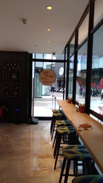 Craft 咖啡店的座位01:高腳椅+吧檯桌正對著商圈內巷道,可以跟路人互看(people watching),落地窗外也有半露天的座位區。圓形木板「Life begins with coffee. (每日生活就從咖啡開始)」