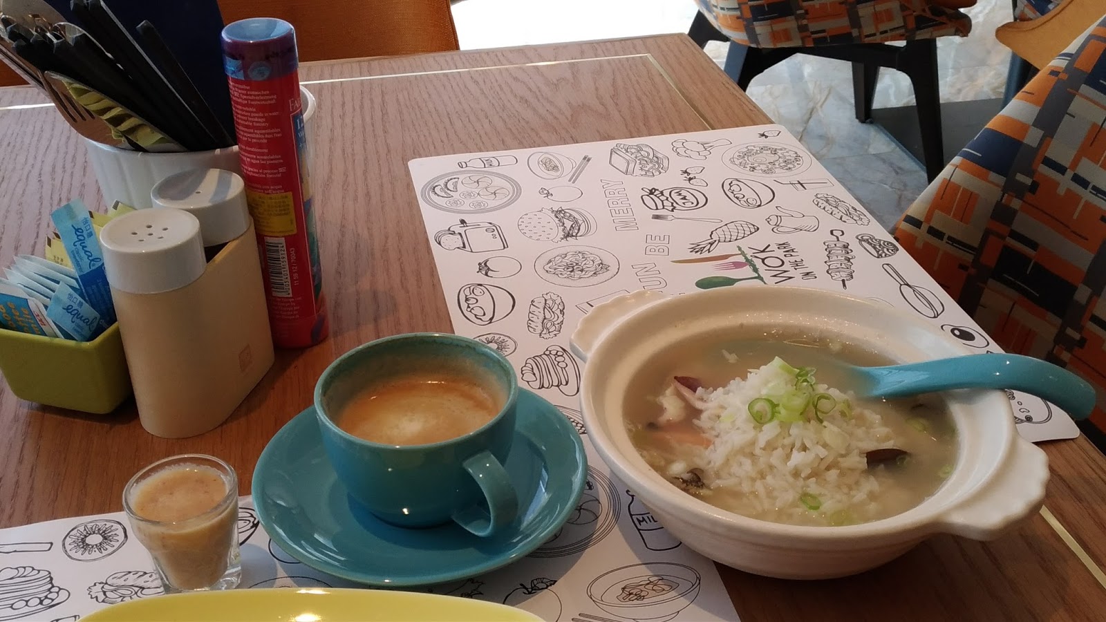 早餐時段另外提供現點現做的海鮮粥(或鳥龍麵),個人特別推薦,一定要嚐鮮(天然的鮮味,料好實在~~) !中:拿鐵;左:試飲的現打果汁。(第一天早餐的經驗因為這個海鮮粥加分太多,所以第二天早餐也是再點一次,只是…點餐後,大概從九點出頭,等到餐期快結束–剩30分鐘–,看到其他桌的粥、麵都上菜了,忍不住問了一下服務人員,才補上–而且現場前前後後不到十桌的住客– …有落漆之感 )
