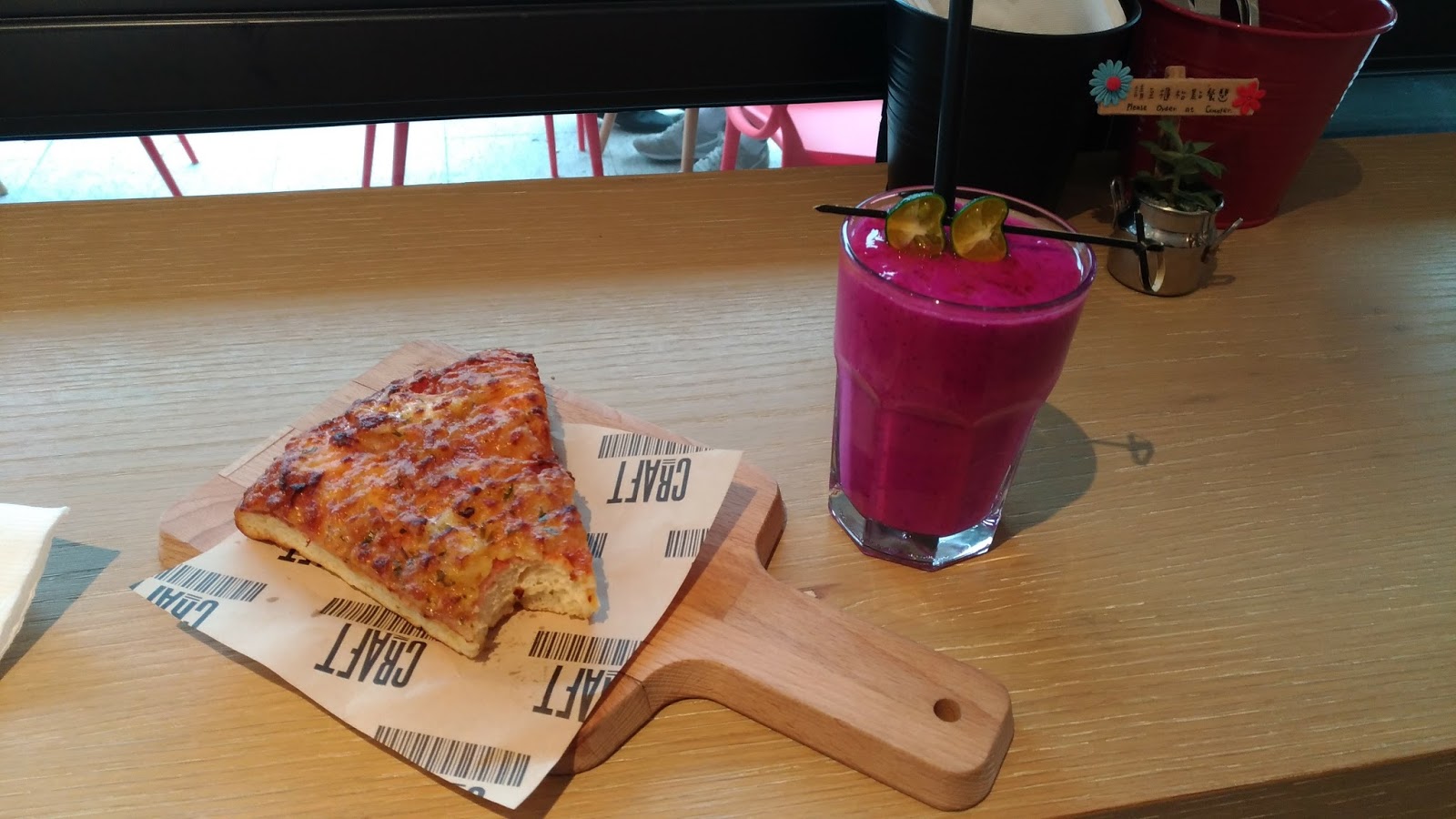 | 下午點了比薩口味麵包 + XX雙果汁(忘了全名,但至少有紅色火龍果 😛 ) |