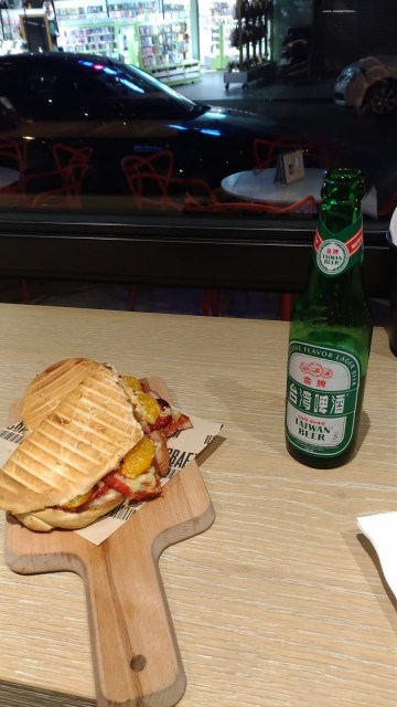 | 晚上十點左右進不了頂樓酒吧,只好到Craft 點個起司蜜柑燻鴨帕里尼+台啤當宵夜 (可惜的是裡頭的起司融化得不夠,內饀有點冷冷的) |