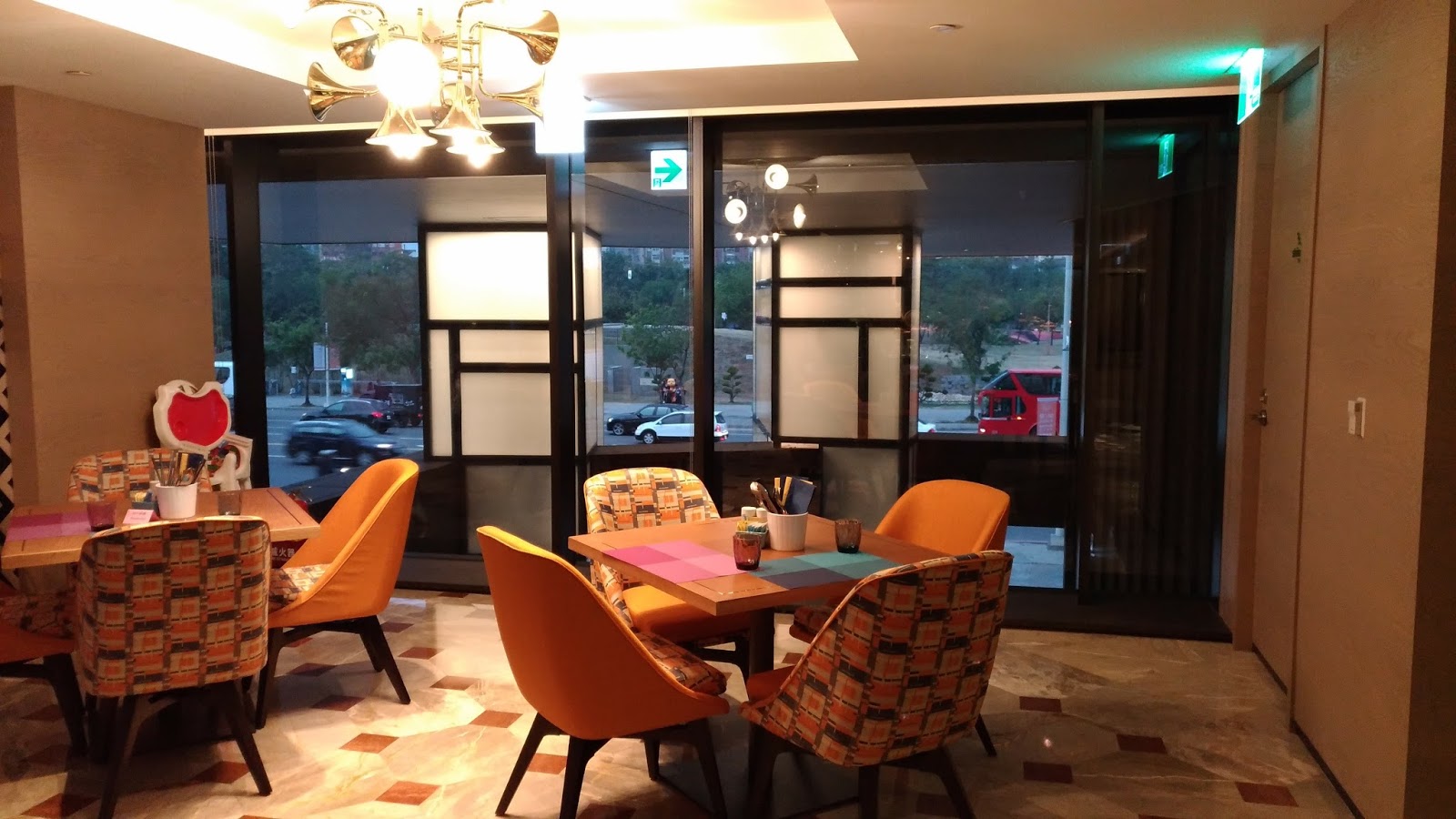 | 面向中央公園及酒店大門的座位區,天花板的燈飾使用號角喇叭造型 |