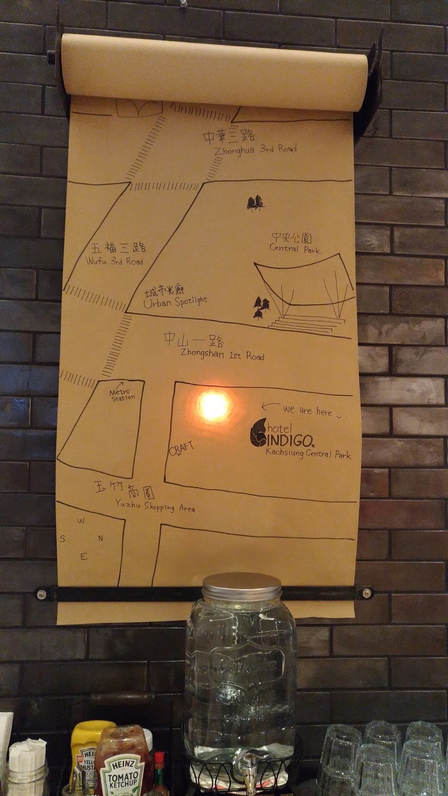 | 自助餐具、飲水區後方的手繪地圖以燈光標示酒店位置,還蠻妙的 |