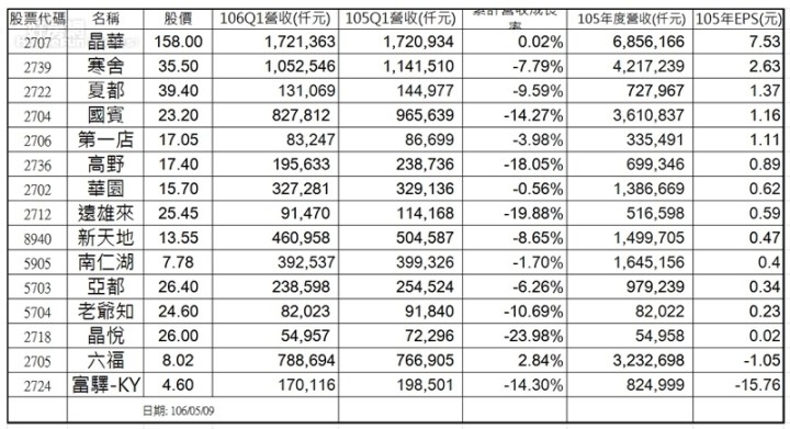 上市觀光類股中的晶華5月12日收盤價156元,和2014年最高點時的375元已有一段差距,國賓兩年來股價跌了11%,夏都兩年跌了15.7%。而老字號觀光飯店六福的股價兩年來跌了30%,5月12日收盤價僅8.16元,在上市觀光類股中僅贏過去年慘賠1.5個股本的富驛。