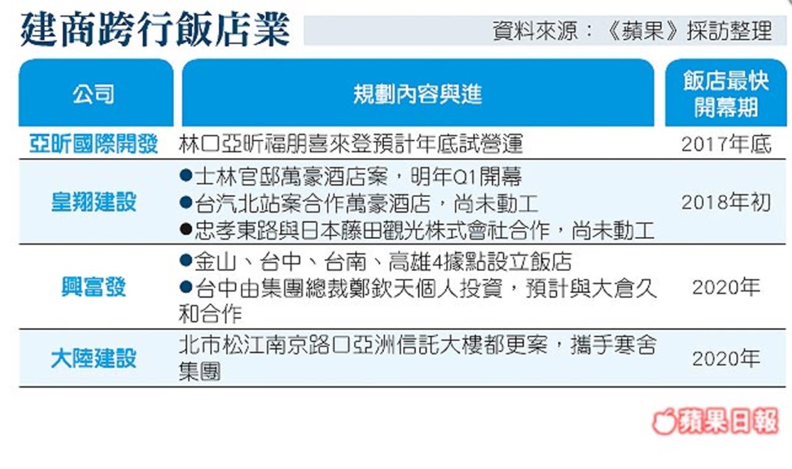 建商跨行休閒產業,今年多家建商不但確定投入飯店業,目標也更加明確。昨日舉辦股東會的亞昕國際,動向最為明確,與福朋喜來登合作的林口飯店案,今年底將試營運,而皇翔士林官邸案,也緊接在明年初開張,興富發更一口氣擘劃4個飯店案。