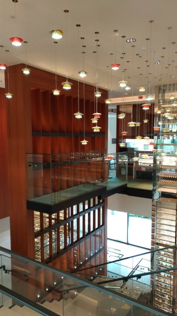 | 從一樓餐廳往二樓走,懸掛的咖啡杯造型吊燈相當特別;而通天的壁櫥是酒櫃 |