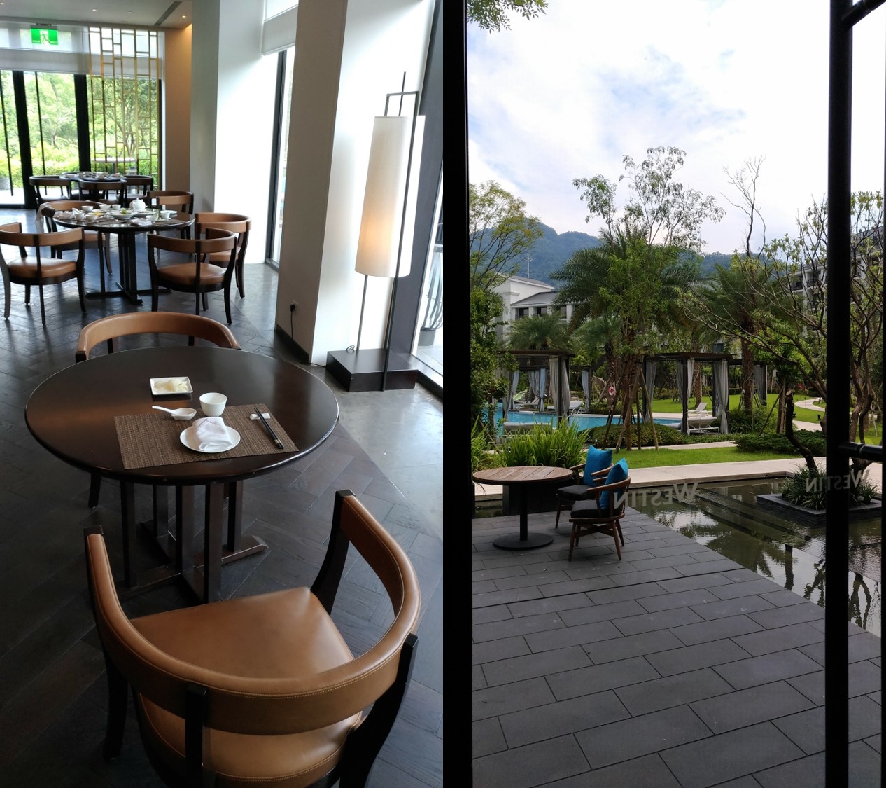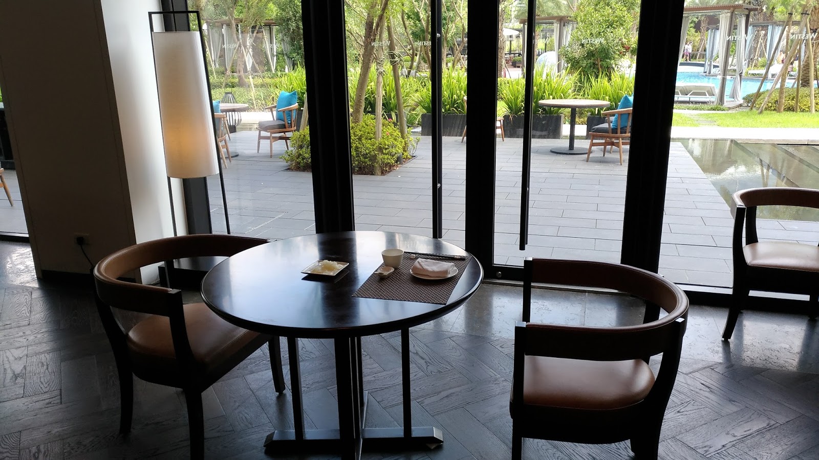 | 大廳酒吧的落地窗與戶外座位區可見戶外泳池區及附近丘陵(在氣候合宜的情況下,戶外座位區應會比室內區來得好) |
