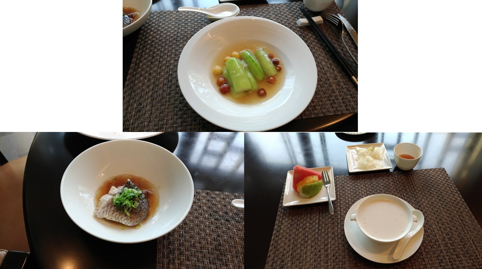 | 上方起逆時針順序:銀杏瑤柱扒絲瓜、樹子清蒸游水鮮、椰汁西米甜湯露+神州四季鮮果 |
