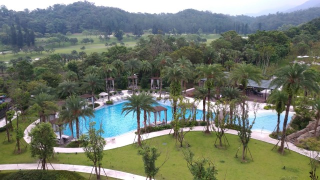 難以置信,7月17日週一下午,渡假酒店的戶外泳池竟陸陸續續有人流進來,絶大部份是家庭客(少數是情侶或夫妻)→有錢有閒的人還真不少 ~~~XD (我是剛好休假來付費體驗二天一夜)。氣溫有些溫熱,泳池水溫似因氣溫的關係也不冷,在池中往返游了幾回,由於縱深距離不長,算是蠻暢快運動的感覺(當然也要稍微閃避一下其他玩水的客人)。