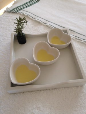 抵達「天夢水療中心(Heavenly Spa by Westin) 」,服務人員引領至休息等候區,準備了檸檬水、熱毛巾以及療程服務問卷做填寫,之後提供三種精油樣品給顧客選擇,而選擇的方式是塗抹樣品在皮膚上,以直覺挑選出適合自己的精油,第一、三種對我來說比較感受不明顯,第二種因為氣味清新且感覺對我當時疲憊的身心有所幫助,便選擇了第二種(後來芳療師有說明該精油是混合天竺葵、薰衣草(第三種我忘了) )。(擺盤如下方圖示)