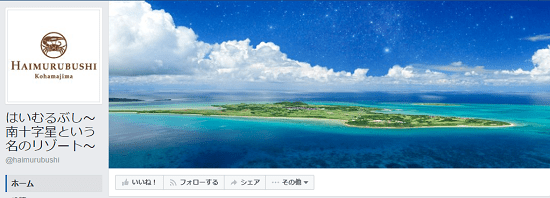 這是度假飯店「はいむるぶし~南十字星という名のリゾート~」的官方臉書專頁,該飯店位於日本八重山群島的小濱島上。與其介紹飯店房間狀況,此專頁的貼文著重於呈現海洋與海岸線的風景美照,主打小濱島的獨特魅力。