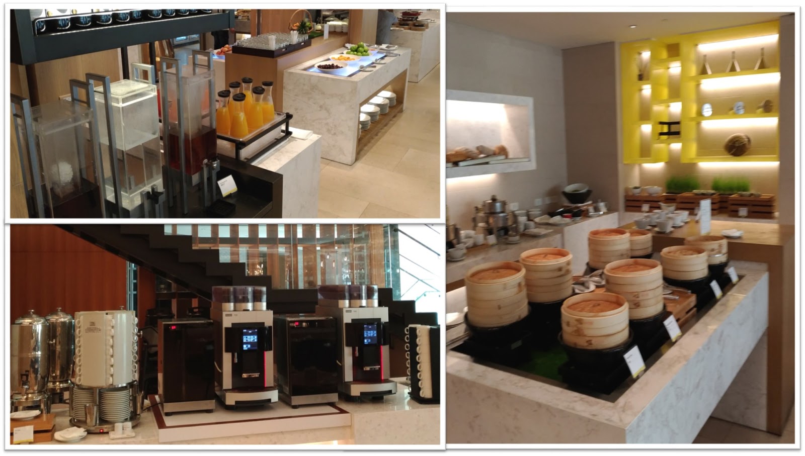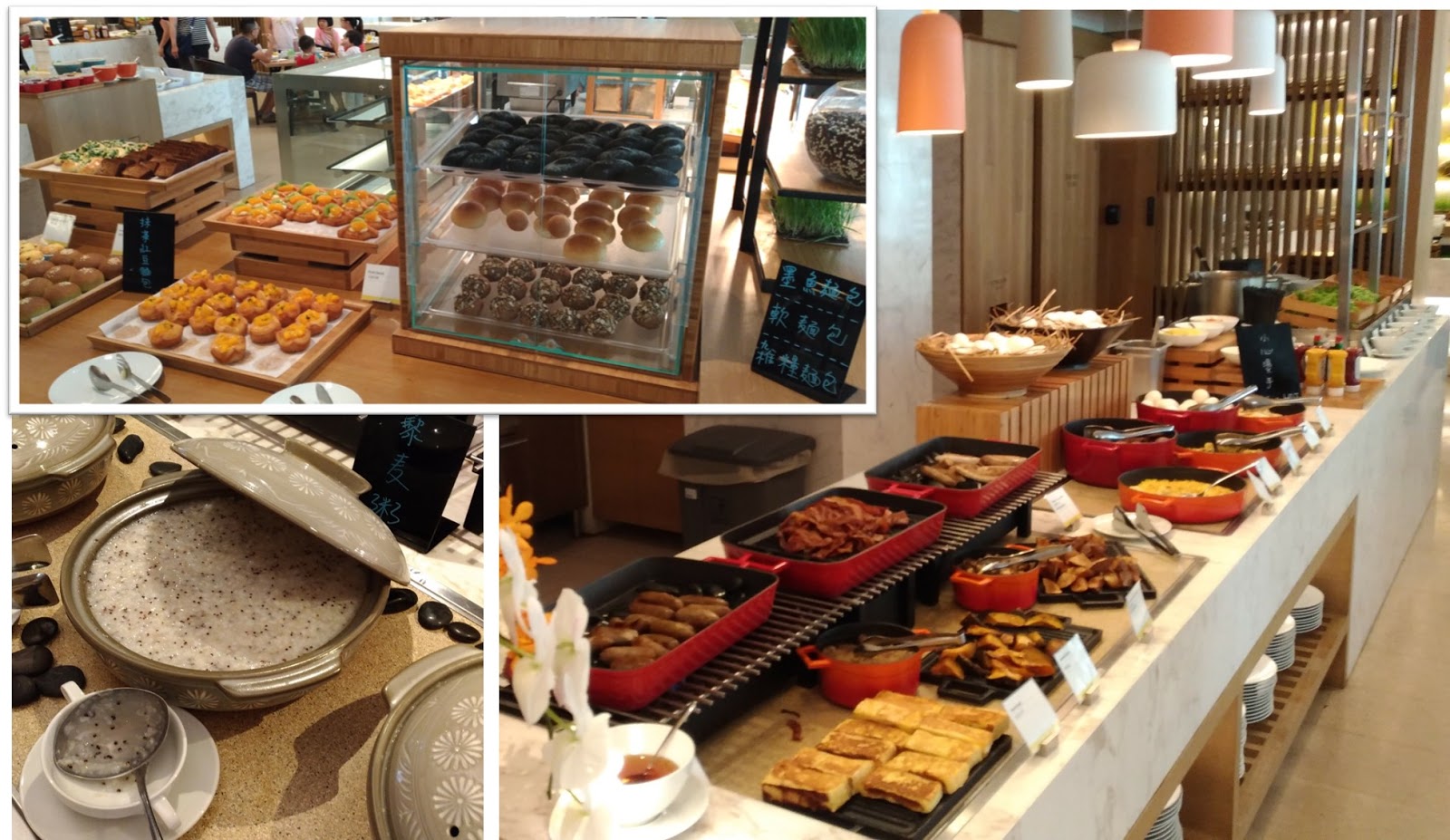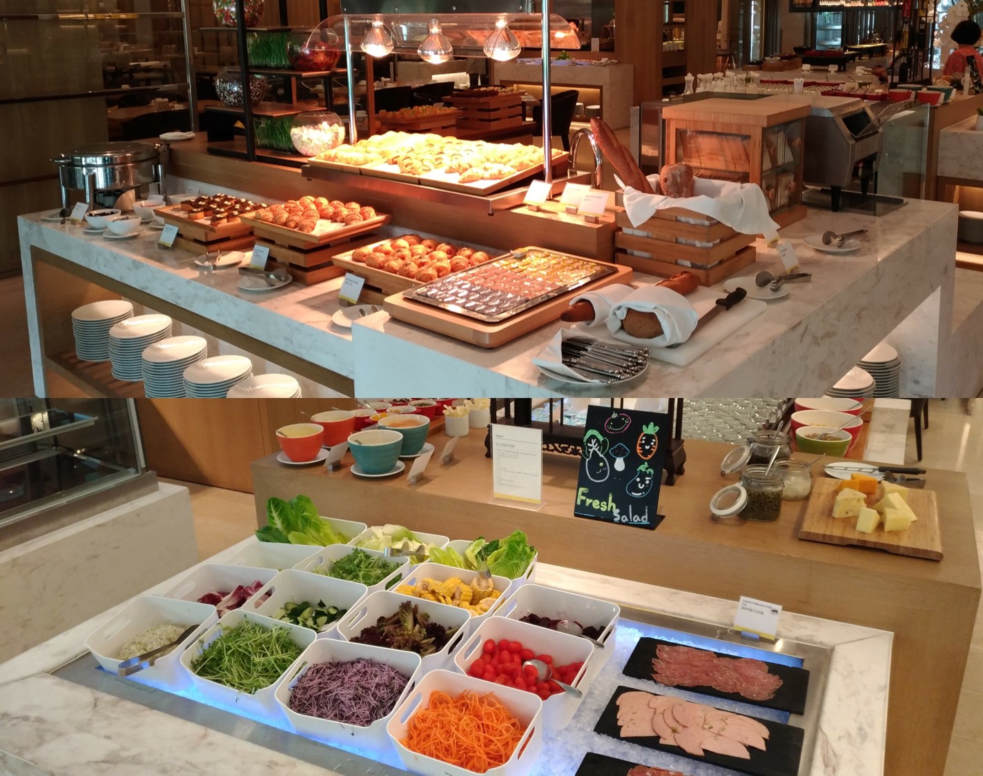 | 左上: 冷飲區與水果區;左下: 熱飲區;右: 中式蒸點與日式料理區 |