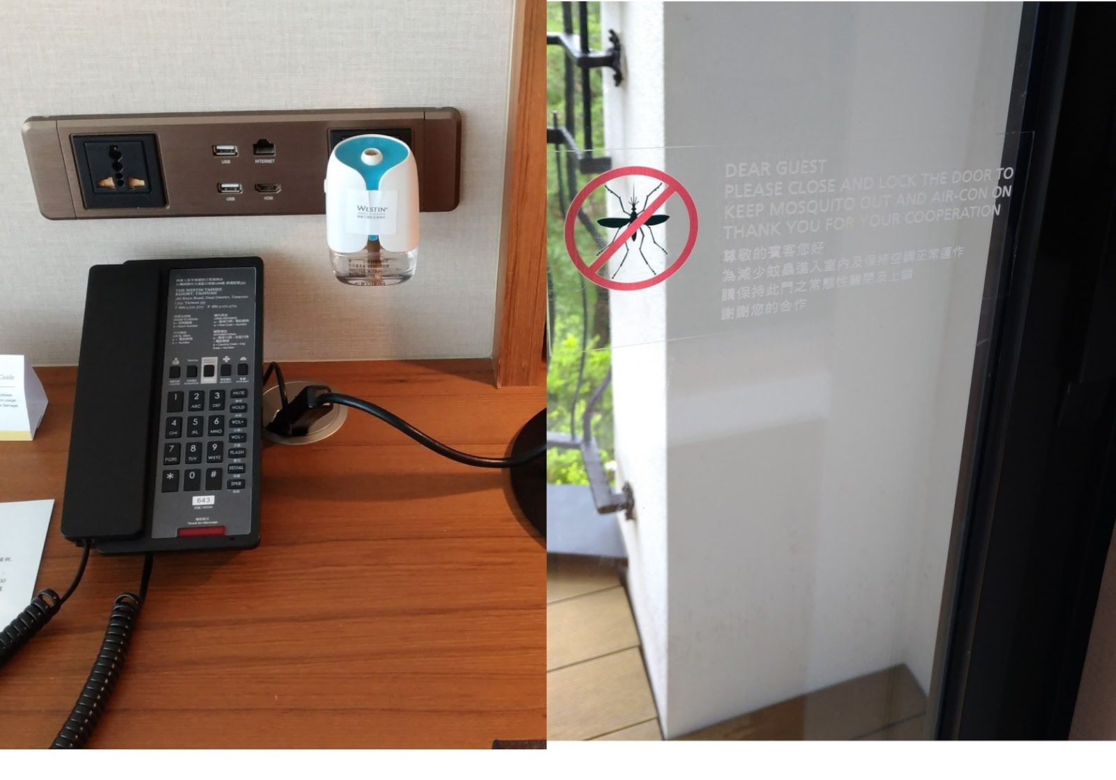 | 左: 由於渡假酒店位於郊外,為避免蚊蟲叮咬,酒店還特別擺放電蚊香;右: 往陽台的玻璃拉門上有標語提醒「為了避免空調外洩及蚊蟲侵入,請保持常態性關閉上鎖」,但晚上還是有到陽台待了一會(進出都有儘快關好拉門),只是回到房內一晚沒有蚊蟲叮咬。 |