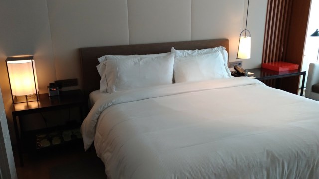在上一篇中,時間點已近一般的就寢時間,客房裡除了基本的紗簾與遮光簾讓室內的睡眠環境不受外來的光線干擾外,標誌性的「天夢之床(Heavenly Bed) 」(由席夢思公司專為威斯汀品牌所特製的床墊)與床組讓住客有優質睡眠。以前曾住過其他威斯汀據點連同這次,床墊支撐性佳,不會過硬或過軟,至於枕頭也是硬度適中。