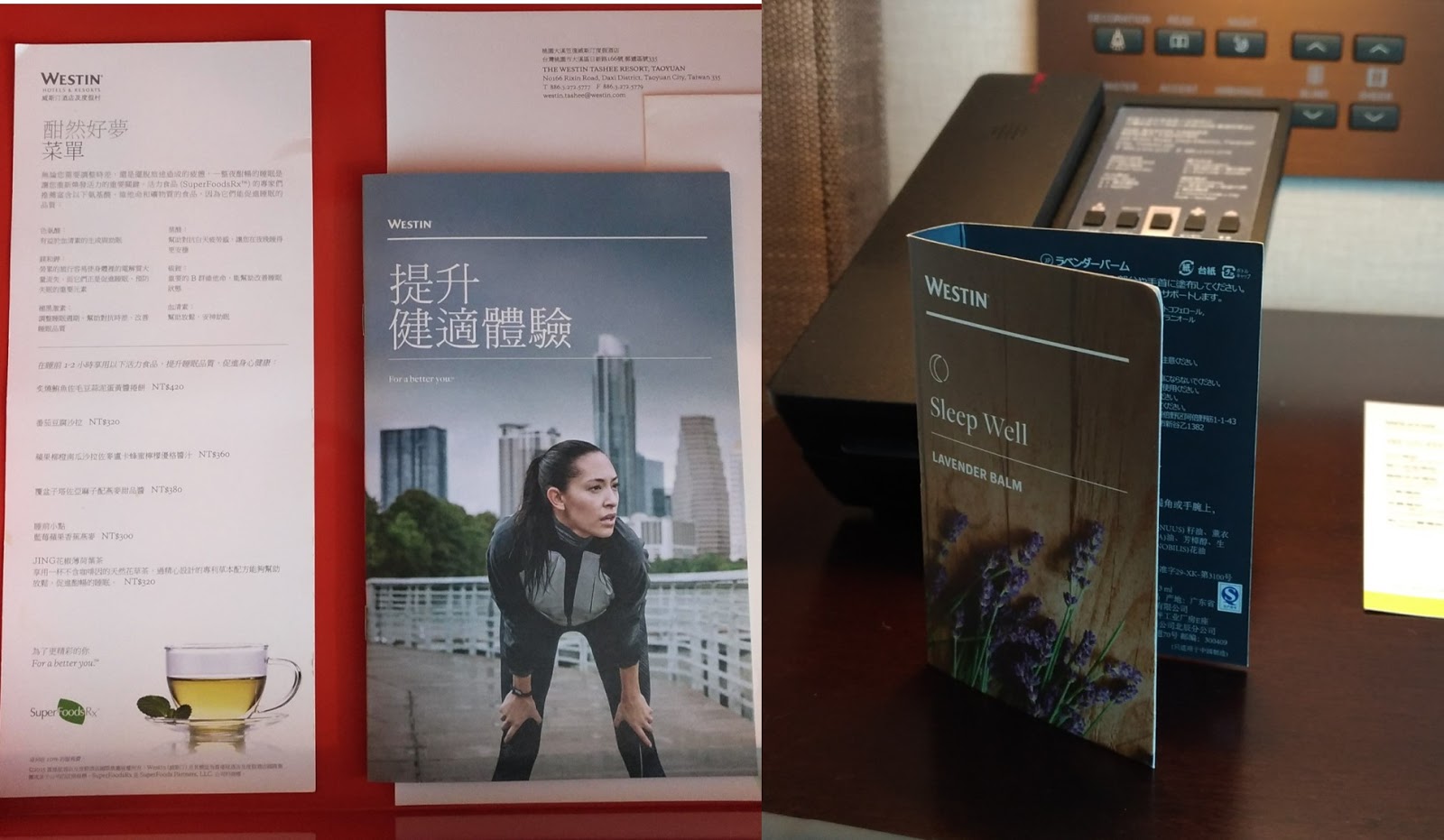 | 左: 威斯汀酣然好夢菜單(助眠餐飲,菜單在床頭櫃的紅盒中);右: 薰衣草香油瓶 |