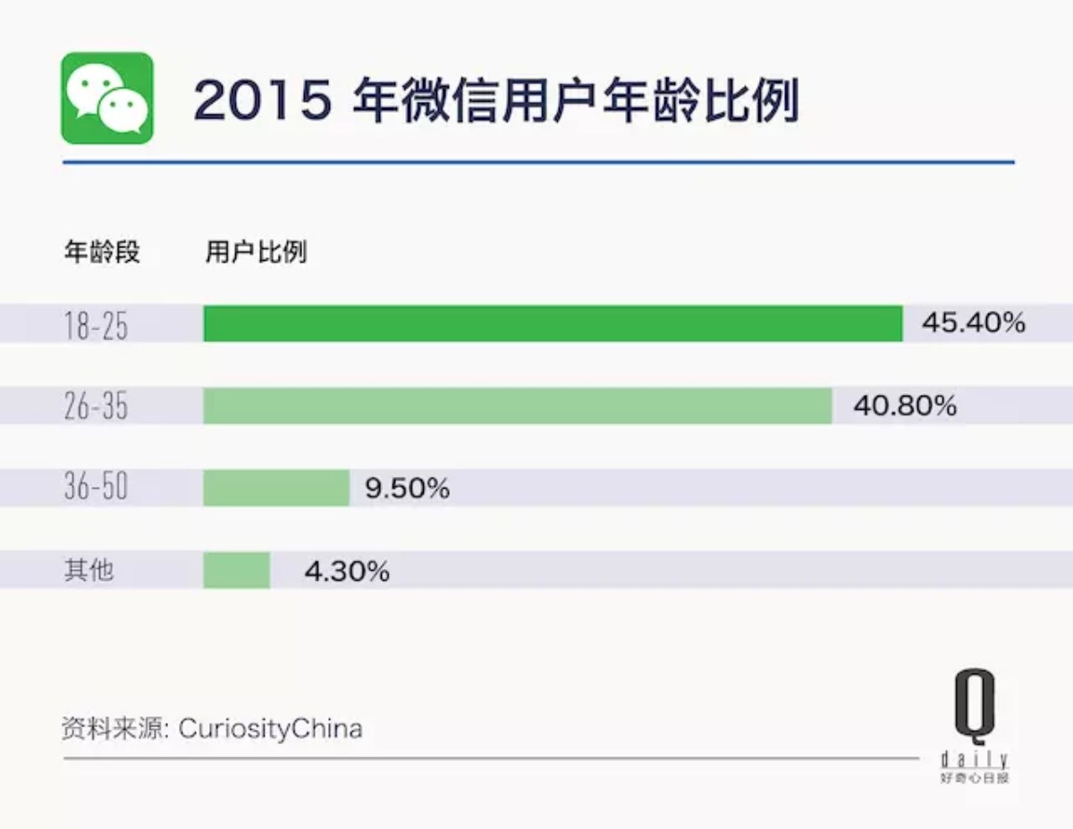 早先 2012 年騰訊公布了微信用戶數據,顯示 20-30 歲之間的青年占了 74%。之後 2015 年一份更細化的年齡分布圖表明,18-25 歲是占比最大的人群,達到 45.4%。26-35 歲用戶則占比 40.8%。