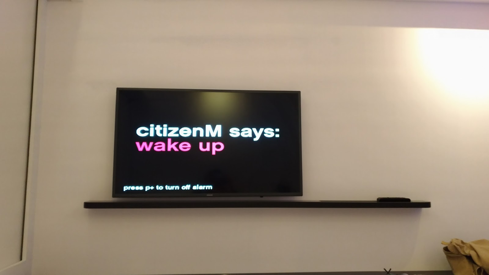 關於晨喚服務(morning call, 或是"叫早服務"),世民酒店的情境面板中有四種喚醒模式叫住客起床,而且同時房內燈光會自動全亮加上窗簾自動升起,所以讓人不得不起床。下方圖示是晨喚服務時的電視畫面:「世民酒店說:『起床!』(citizenM says: wake up)」,而前晚選擇的模式是Gentle mode,以為會有多「溫和」,其實是人聲在房內「碎碎唸」著倒數的英文數字,從100開始唸,另類讓人煩到不得不起床的方式。