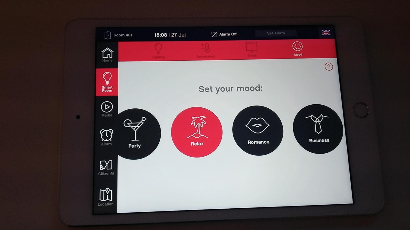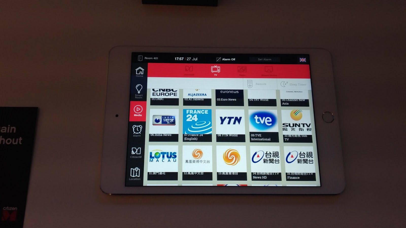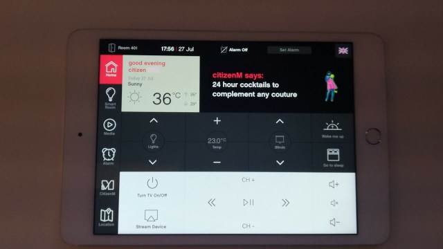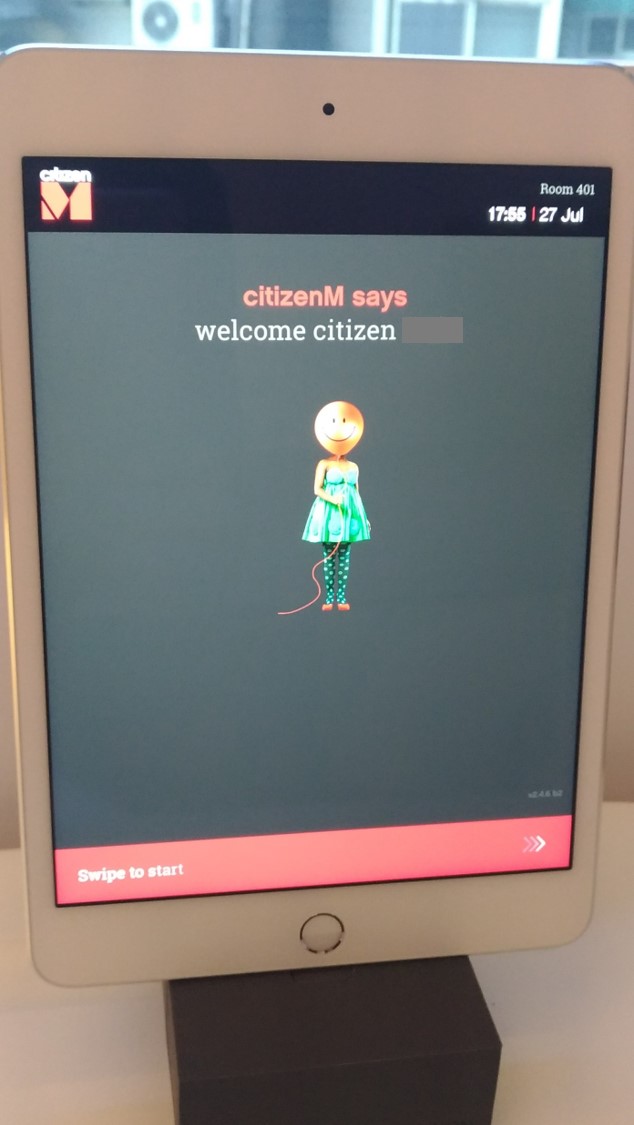 一進門,情境面板及電視螢幕都有歡迎畫面(名字的部份已特別處理):「世民酒店說:『歡迎世民 XXX(名字)』(citizenM says: welcome citizen XXX) 」感覺就有種奢華與個人化服務的FU,雖然技術不會太難,但印象中在五星酒店(比方四季酒店)才會有這樣客房迎賓方式,而世民酒店採用這樣的技術服務倒是特別。