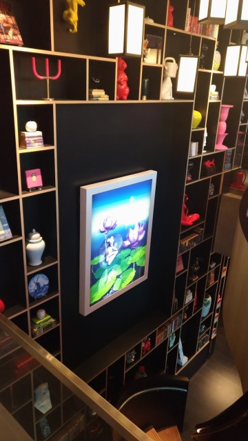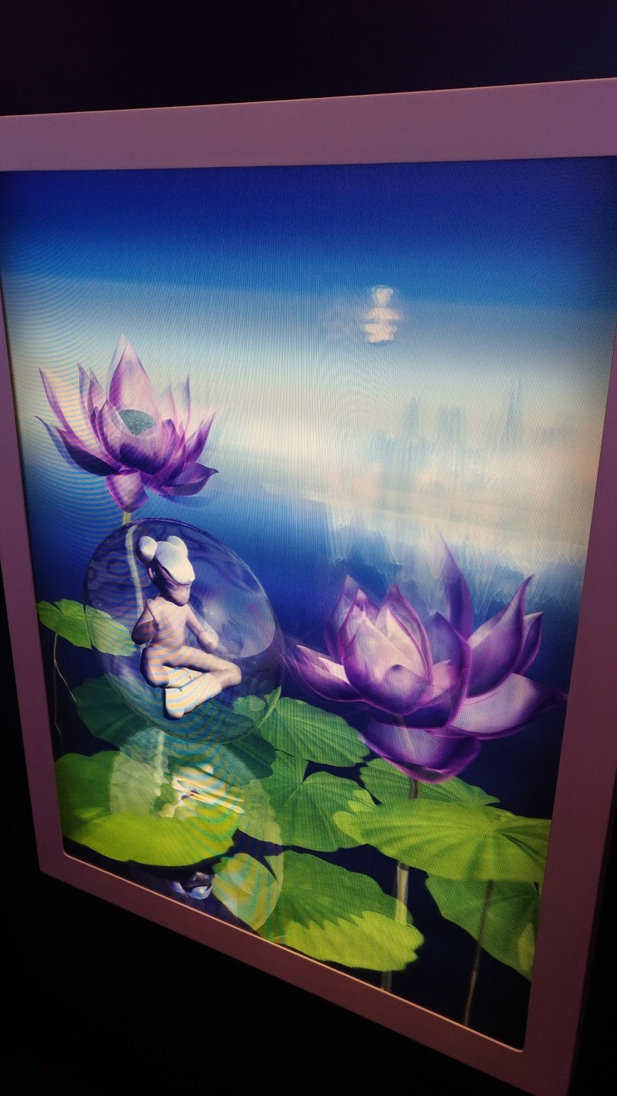 這幅作品的有趣之處在於不同角度所看的內容會有些許變化,原理像是小學生用的墊板,表層不同角度的折射,會讓底層的畫作內容呈現不同的變化。( 感恩Seafood, 讚嘆Seafood?! XD 我個人偏好阿彌陀佛→西方極樂世界的七寶池中,蓮花大如車輪,赤色赤光….)