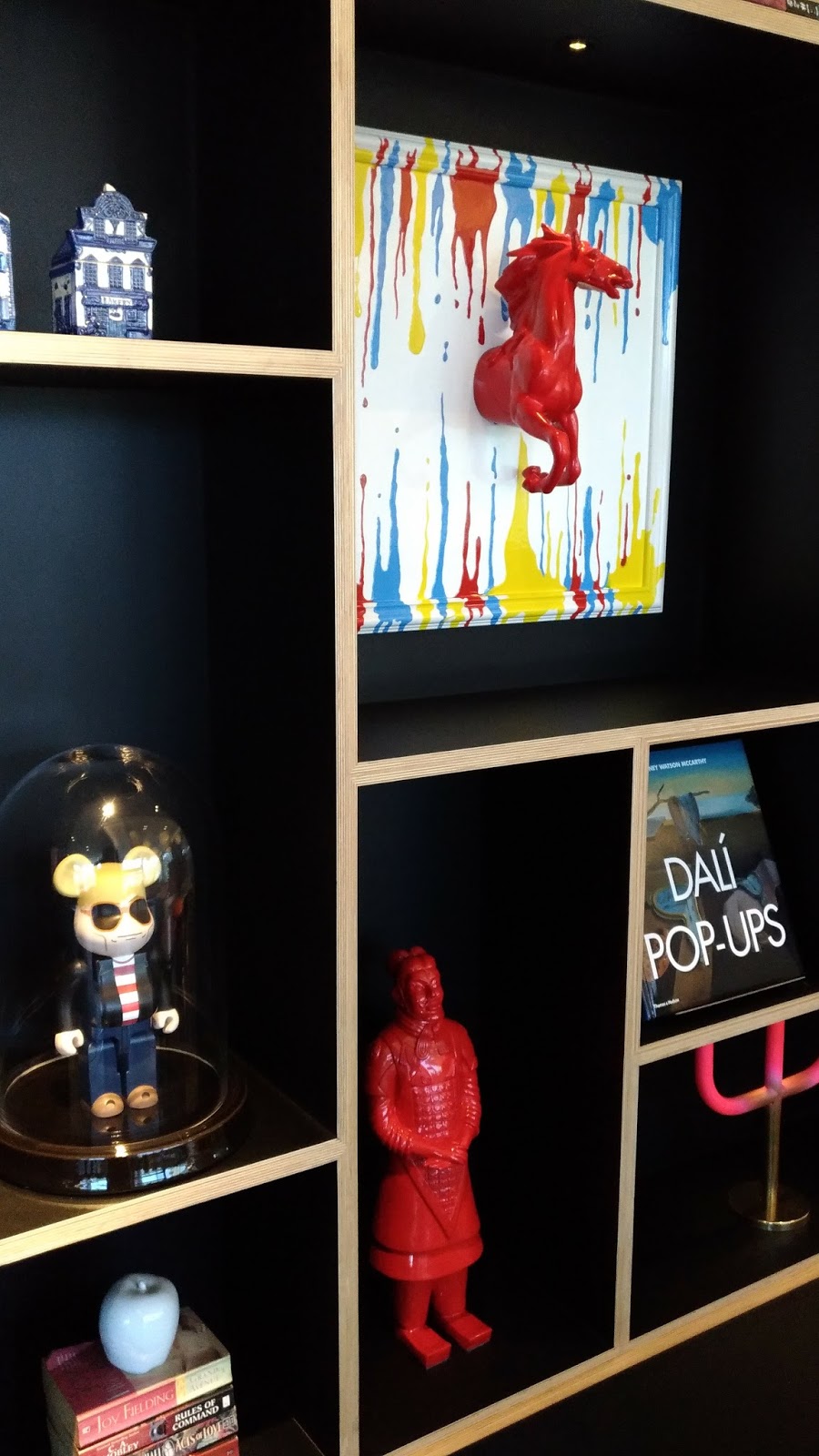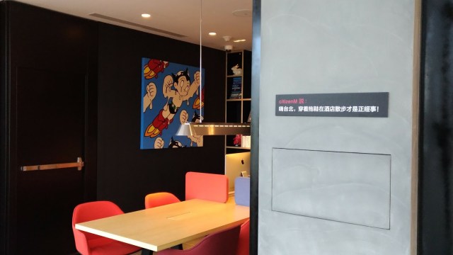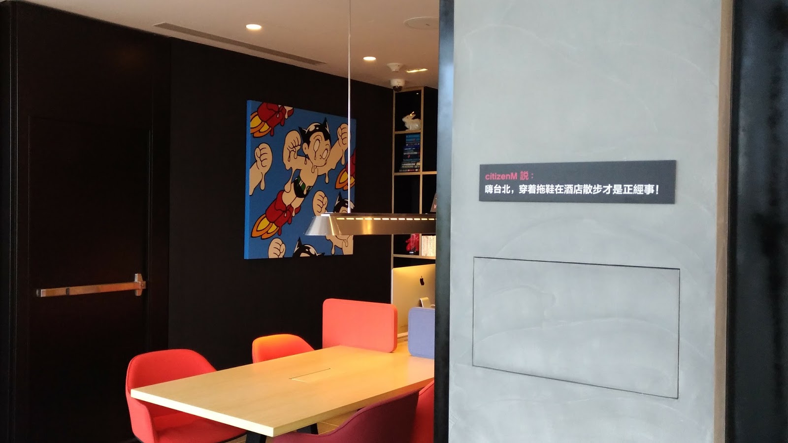 左:上網區後方有幅正在融化的原子小金剛畫作 / 這柱上標語「世民酒店說:『嗨台北,穿著拖鞋在酒店散步才是正經事!』」有些打臉我之前分享的文章看法→因為我一直覺得穿著旅館的白色免費拖鞋在旅館四處(甚至外頭)趴趴走很不妥當合宜,「所以….?」「沒看我默默拿出夾腳拖來穿。XD」「派屈克,我剛好有一雙藍白拖。」「唉喲~~早說咩~~~」XDD