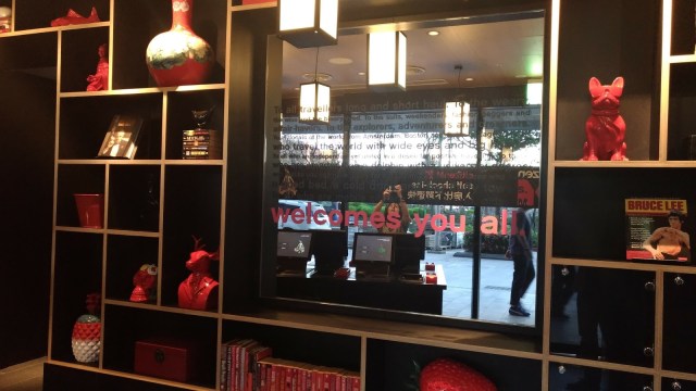 (穿插)一樓接待區的牆面設計,東方紅(或世民酒店紅?)的概念