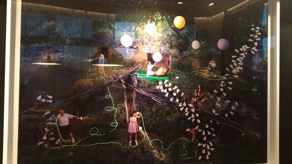M餐吧區的畫作。簡易電話傳聲筒+如月亮的汽球在大樹裡?很特別