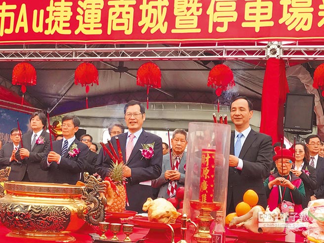 | 同在新莊副都心的「新莊Au捷運商城暨停車場興建營運移轉案」今年4月舉行動土典禮,當時新北市長朱立倫(前右)、宏匯集團董事長許崑泰(前左)出席動土儀式。(本報資料照片) |