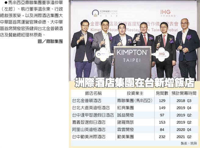 為搶攻台灣觀光旅宿商機,旗下擁有12個旅館飯店與酒店式公寓品牌的洲際酒店集團(InterContinental Hotels Group)大中華區首席營運長陳卓德(Justin Channe)昨(13)日與馬來西亞鼎聯集團行政總裁家榮簽約,正式將洲際酒店集團旗下高端精品酒店「金普頓酒店」引進台灣。