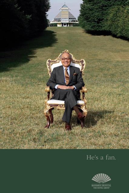 藉英文「fan」的雙關語及不同的用法 ─ 既是文華東方酒店的標誌「扇子」也是「(狂熱)愛好者、粉絲」之意,將各國影視名人、時裝設計師、建築師、音樂家等名流與業界傑出人士,經由相當時間的酒店住宿體驗,為文華東方酒店集團背書,一種「魚幫水,水幫魚」的概念,一種相互拉抬策略,同時也是對於該酒店集團的肯定與信賴。(就說站對背板拍照很重要吧~~ XD )