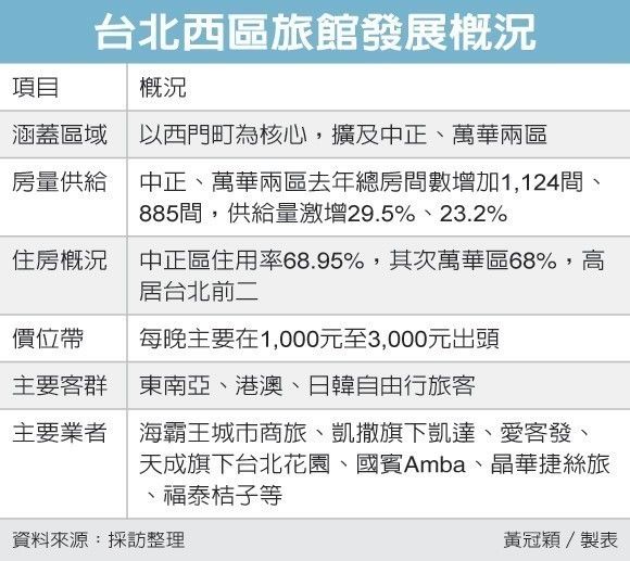 台北西區旅館以西門町為核心急速發展,海霸王、凱撒、愛客發、李方等集團加碼布局,雖旅館供給量大增,但因價格實惠,受到東南亞、日、韓等國自由行旅客捧場,住房率高居台北之冠。