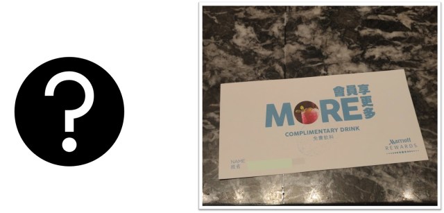 其實二者在辦理入住時都沒有提到「您是我們的萬豪禮賞會員」(這是有會員制的旅館酒店之第101句必要台詞),但隨後的一招就高下立判→ 免費飲料兌換券(大笑)。下圖右是在台北六福萬怡酒店的櫃檯拍的,至於下圖左則是給台北萬豪酒店的位子(因為什麼都沒有,會員與一般人都一樣)。